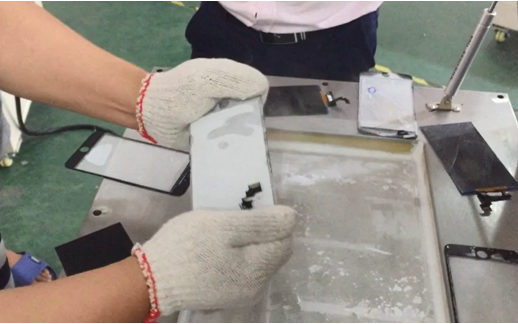 6、开始分离作业时,拿住产品的四个角,轻轻扭动,使液晶与盖板玻璃脱离。如果产品厚而